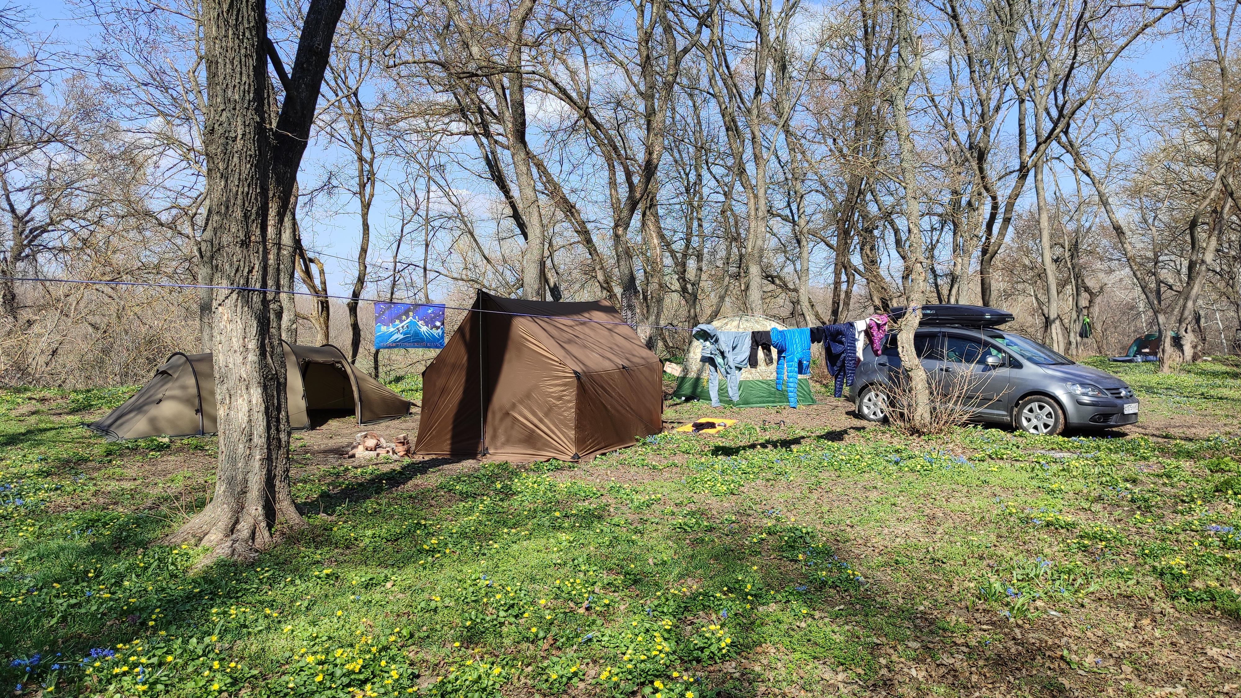 Детские развлечения с раскопками и туристическим снаряжением. Банные процедуры и вкусный шашлык. Просыпающаяся природа с набухающими почками на ветвях и уже распустившимися цветочками среди зелёной травы. И вечерний костёр.